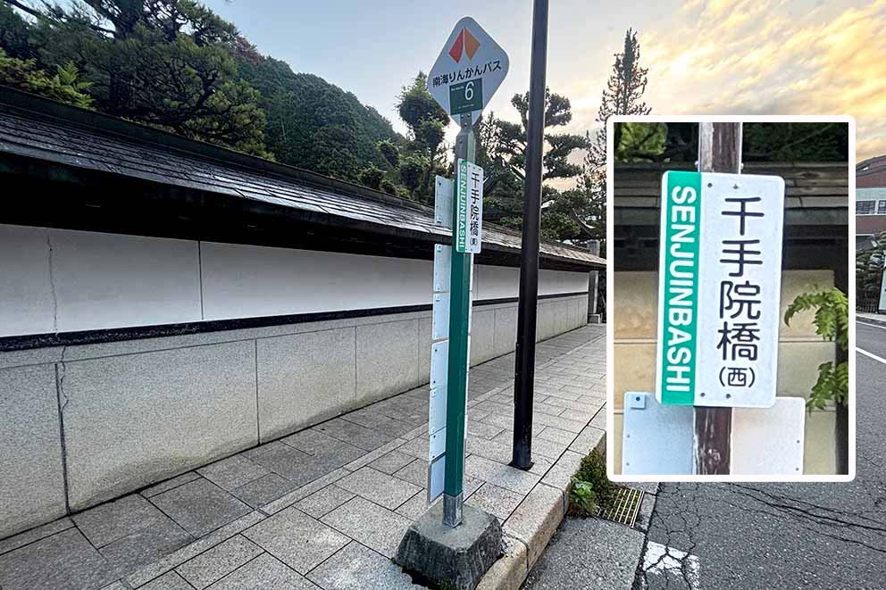 Senjuinbashi (Higashi) bus stop: This central intersection can be confusing. This is Koyasan bus stop No. 6 located between the fire department and Takamuro-in Temple.