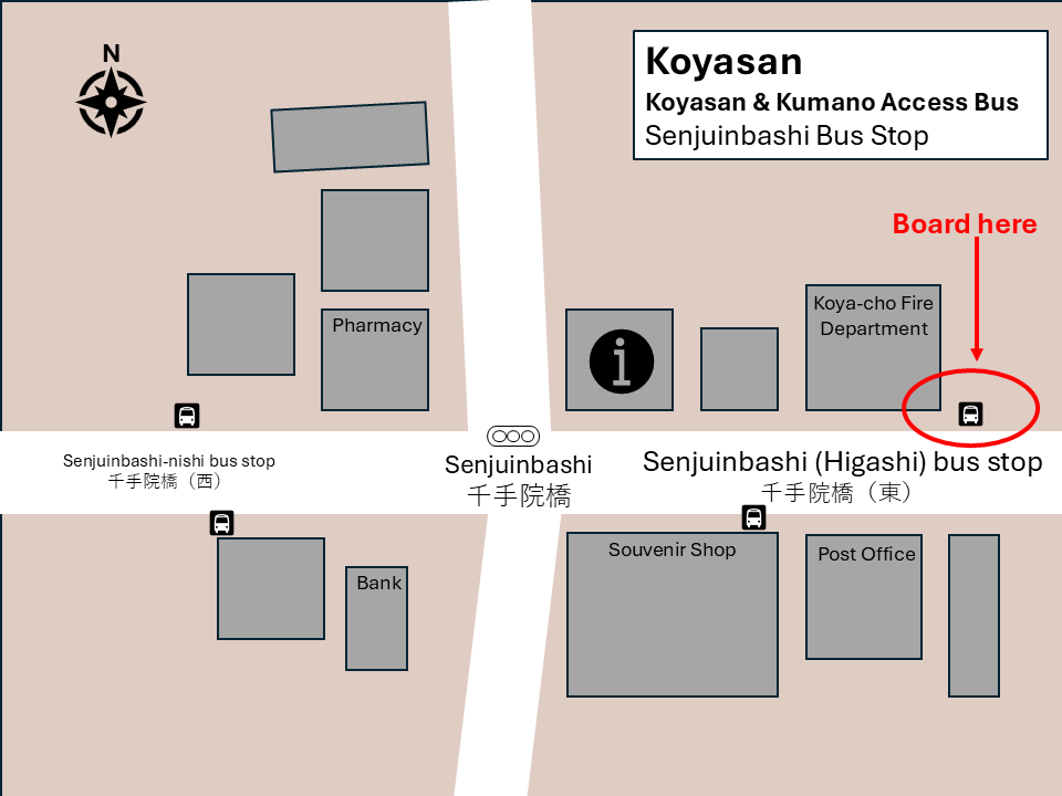 "Senjuinbashi (Higashi)" is the closest bus stop to temples and accommodations in Koyasan.
